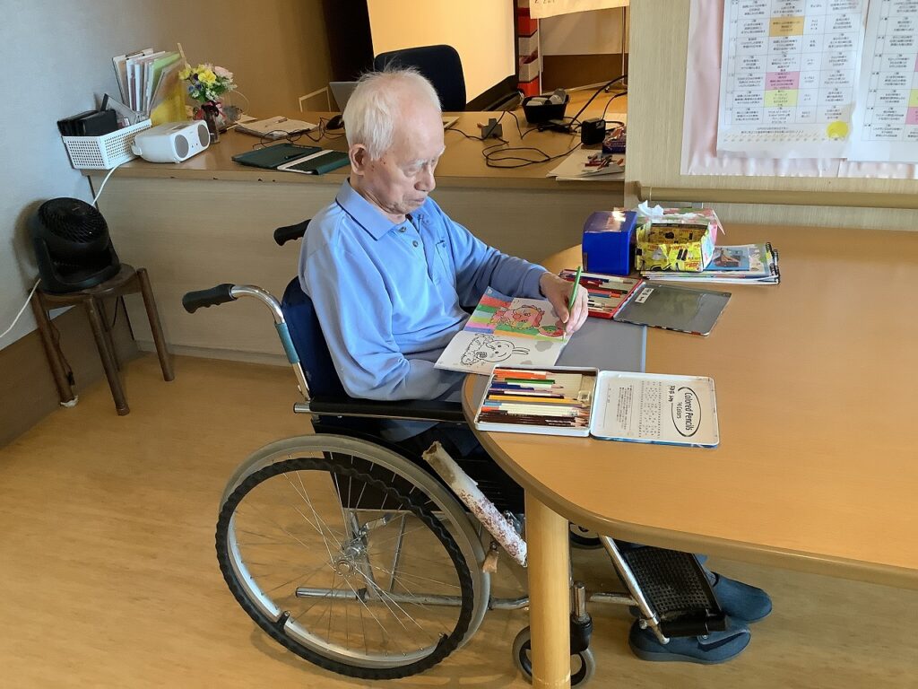その中でも、塗り絵に熱心に取り組まれるご利用者様もいらっしゃいます。職員と色づかいについて話し合ったり、完成した作品を見ながら笑顔で会話されたりする姿が印象的です。
